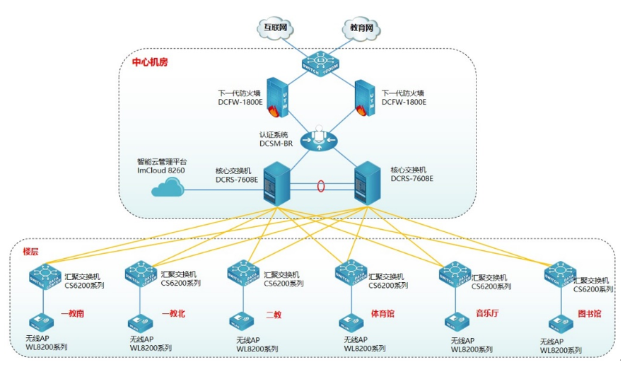 为方便用户对无线管理和维护,提升用户无线体验,使无线更智能化,此次采用long8头号玩家 龙八国际智能云管理平台ImCloud 8260实现无线统一的管理、维护、认证,并可实现对全网无线设备管理、实现易部署、易维护、易扩展的无线网络。long8头号玩家 龙八国际云管理ImCloud方案是网络服务的新模式,基于云端实现网络服务和管理,将复杂的网络管理简单化、智能化、可视化,提升用户网络体验。同时为了保证无线的安全,无线采用Portal准入认证,云管理ImCloud和long8头号玩家 龙八国际身份认证系统DCSM-BR实现联动,用户需要顺利获得账号和密码认证成功后才能接入无线网络,在保证无线连接的便捷性同时兼顾无线的安全性。