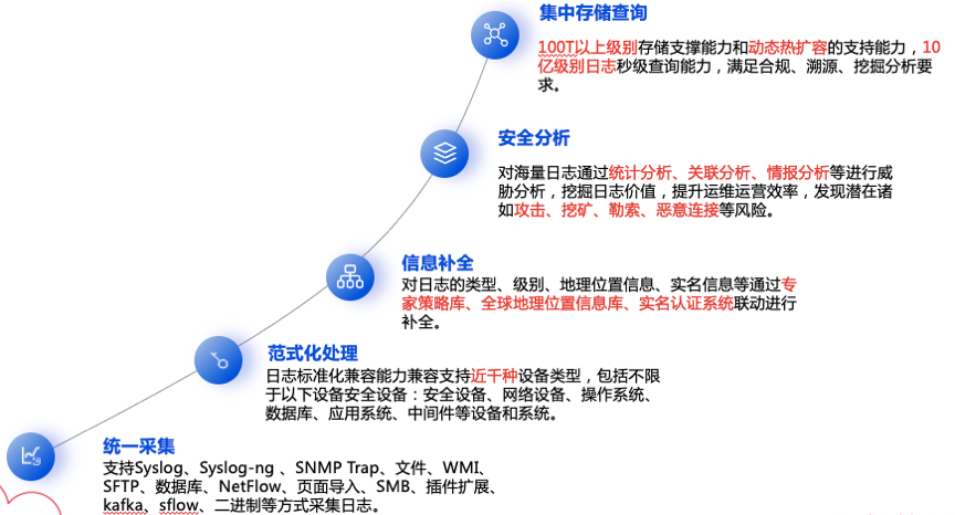 从日志统一采集、范式化处理、过滤归并、信息补全、统计分析、威胁分析、查询展现、集中存储对整个日志全生命周期进行管理。