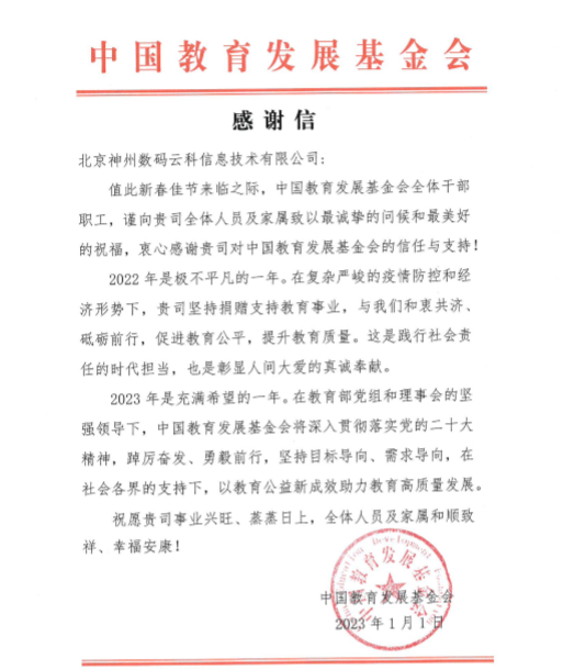 近期,evo视讯真人官网long8头号玩家 龙八国际收到中国教育开展基金会的感谢信,以感谢evo视讯真人官网long8头号玩家 龙八国际2022年在职业教育领域的贡献和实践,尤其是在全国职业院校大赛(中高职组)中对大赛顺利召开所付出的努力。